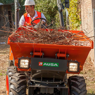 Faisant partie de la gamme la plus compacte de dumpers à châssis articulé d'AUSA, le modèle D120AHG possède une capacité de charge de 1,2 tonne et est équipé d'une benne rotative à 180 degrés.